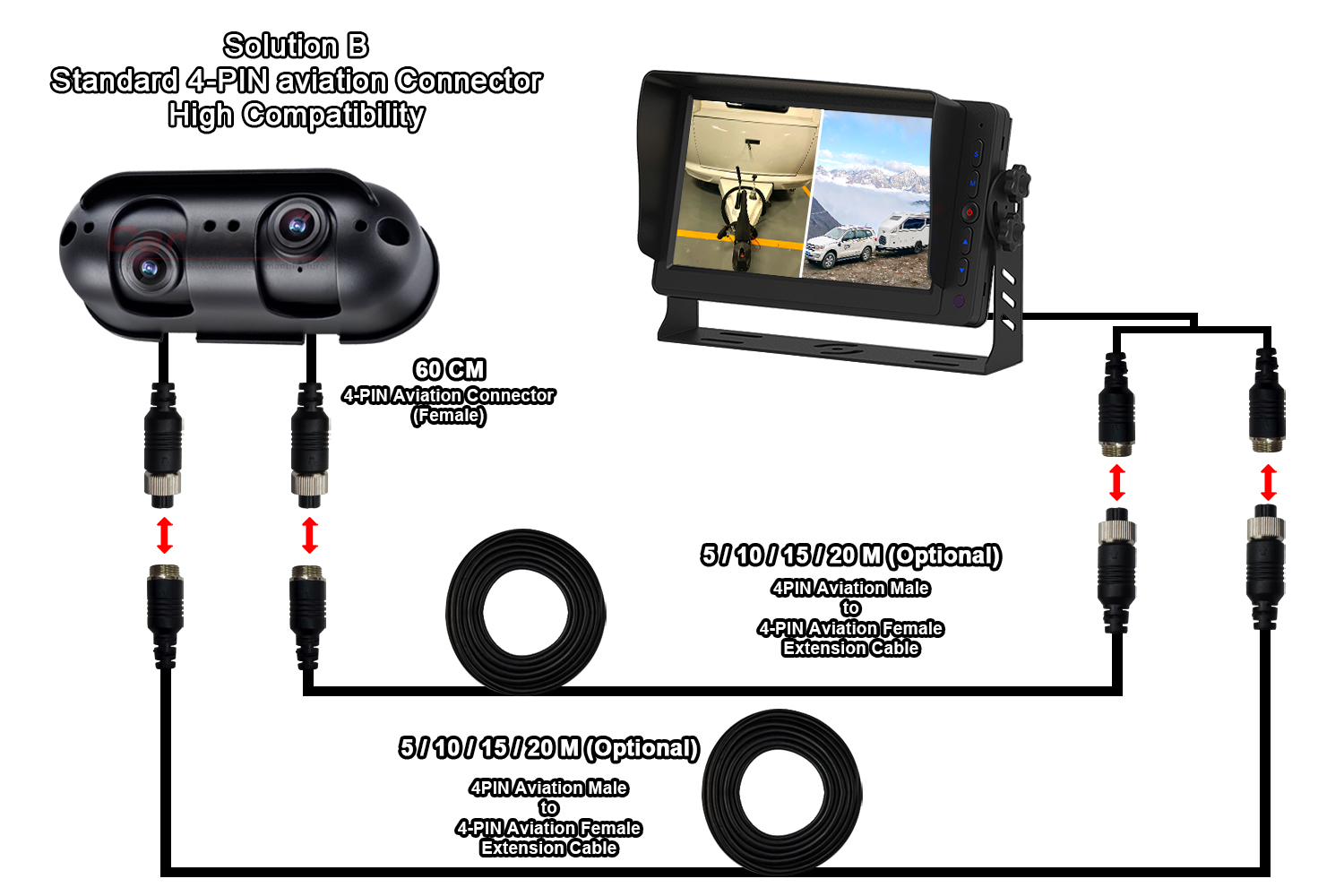 AI Откриване на мъртва точка Камера за обратно виждане Вградена звукова и светлинна алармаКамера за обратно виждане Carleader AHD Starlight с двоен обектив, подходяща за RV дом на колесника, AHD камера с нов дизайн с частни инструменти с отлично качество, интегрирана с двоен обектив в една камера и ъгъл на обектива, регулируем отделно, което позволява на потребителя да гледа както на близко, така и на далечно разстояние на един и същ монитор. Тази камера е подходяща не само за тежкотоварни превозни средства, като камион, автобус, мотокар и т.н.; също така подходящ за превозно средство за дом на колела, като RV и каравана.
