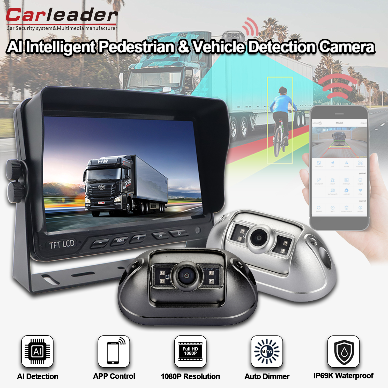 Поддържа настройка за калибриране на AI с мобилен телефон чрез WIFICarleaderAI BSD Система за камера за превозни средства за откриване на пешеходци и превозни средства високопроизводителна 7-инчова AI BSD система, която поддържа откриване на пешеходци и превозни средства и алармира водача. камера с USB порт WIFI модул, позволява на потребителя да регулира калибрирането на AI функцията и основната настройка на камерата с мобилен телефон чрез WIFI връзка, включително опция за резолюция,калибриране на областта на откриване, тип и сила на звука на алармата, чувствителност на задействане на откриване, опция за откриване на обект и т.н. Помогнете на потребителя да монтира по-добре своето превозно средство чрез регулиране.