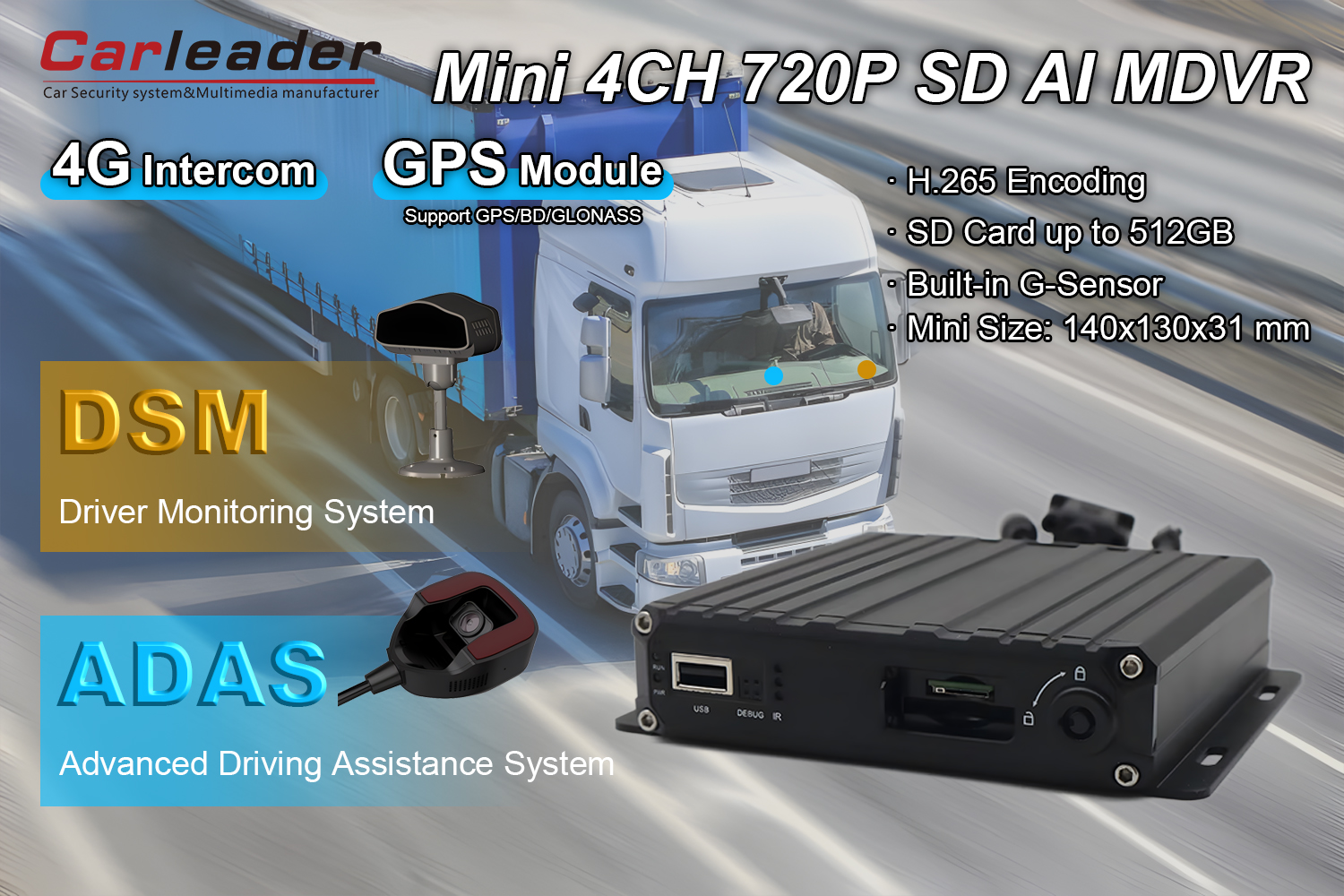 Carleader4CH AI Intelligent Mobile DVR с DSM и ADAS камера Идеален за използване в търговски автопаркове, обществен транспорт, превозни средства на правоприлагащите органи, системи за безопасност на лични и търговски превозни средства