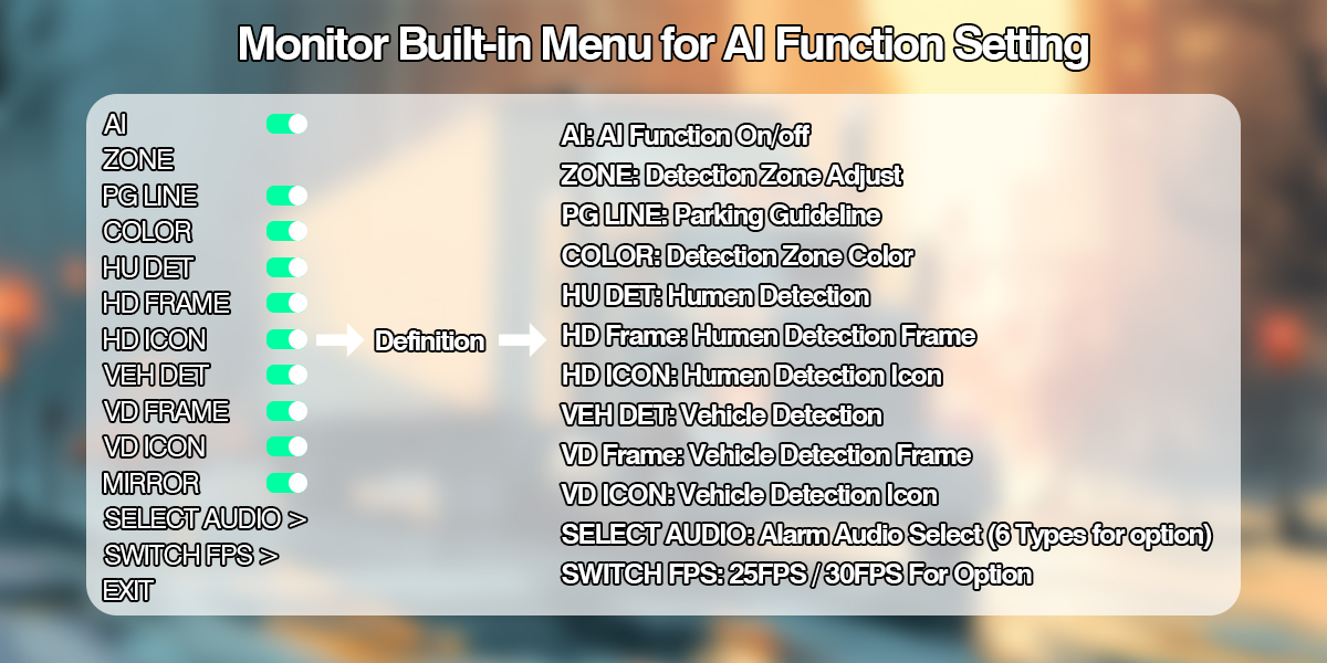 Carleader7-инчова AI BSD система за наблюдение за откриване на мъртва зона Поддържа AI калибриране, решение за камера с изкуствен интелект, което поддържа откриване на пешеходци, откриване на превозни средства, значително повишава безопасността по време на шофиране, монитор с вградено меню за калибриране на AI, позволява на потребителя да регулира зоната на откриване, включване/изключване на цветния дисплей на зоната за откриване, тип звук на алармата, показване на икони на превозно средство и пешеходец, избор на обект за откриване и др.