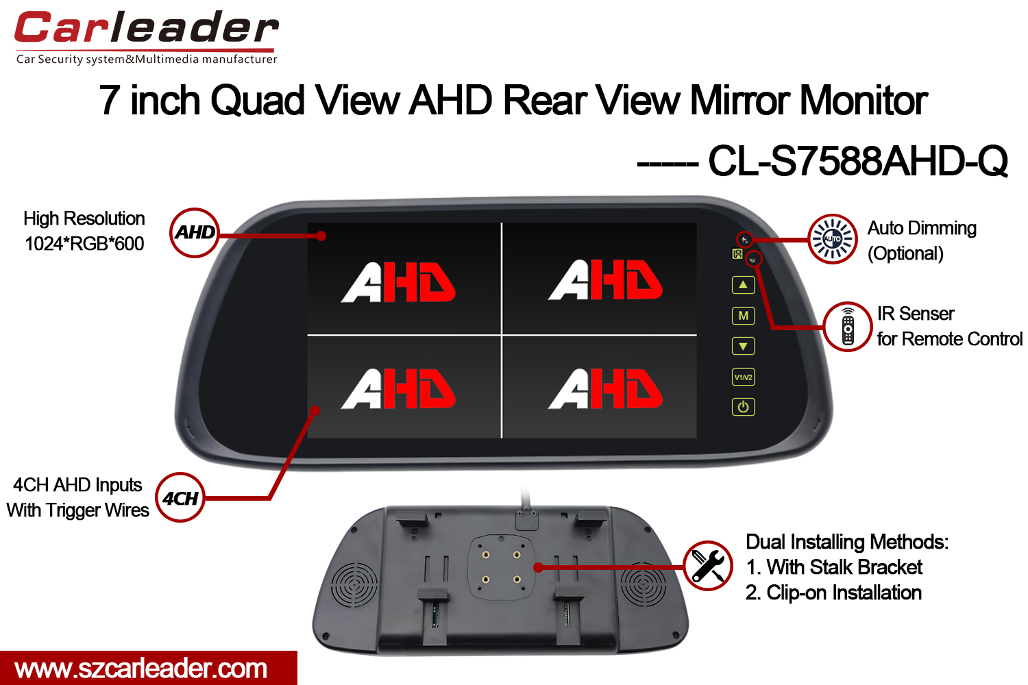 Надстройте доCarleader7-инчов 4CH Quad AHD монитор с огледало за обратно виждане поддържа двойна инсталацияза несравнима видимост, надеждност и спокойствие на пътя.
