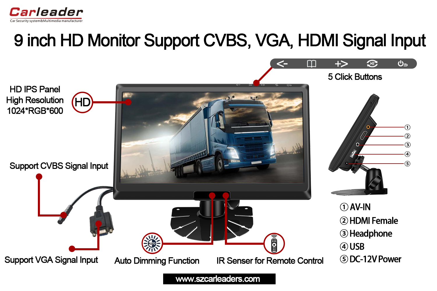 НашитеCarleader9-инчов IPS екран HD монитор поддържа CVBS+HD+VGA входовеима най-доброто видео качество и яснота от всички наши монитори за превозни средства,и има 5 специални бутона за щракване в горната част на монитора, 9-инчов IPS екран Поддръжка на монитор за кола CVBS,HD,VGA в момента е на склад и в продажба.