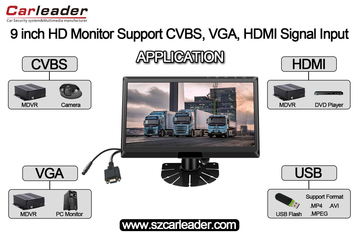 Carleader9-инчов IPS екран HD монитор поддържа CVBS+HD+VGA входовее високопроизводителен HD монитор, предназначен за наблюдение на превозни средства и управление на MDVR автопарк. Автомобилният монитор поддържа CVBS, HD и VGA сигнални входове. И ако MDVR има VGA или HD интерфейс, може да се използва с 9-инчовия IPS екран на автомобилния монитор.