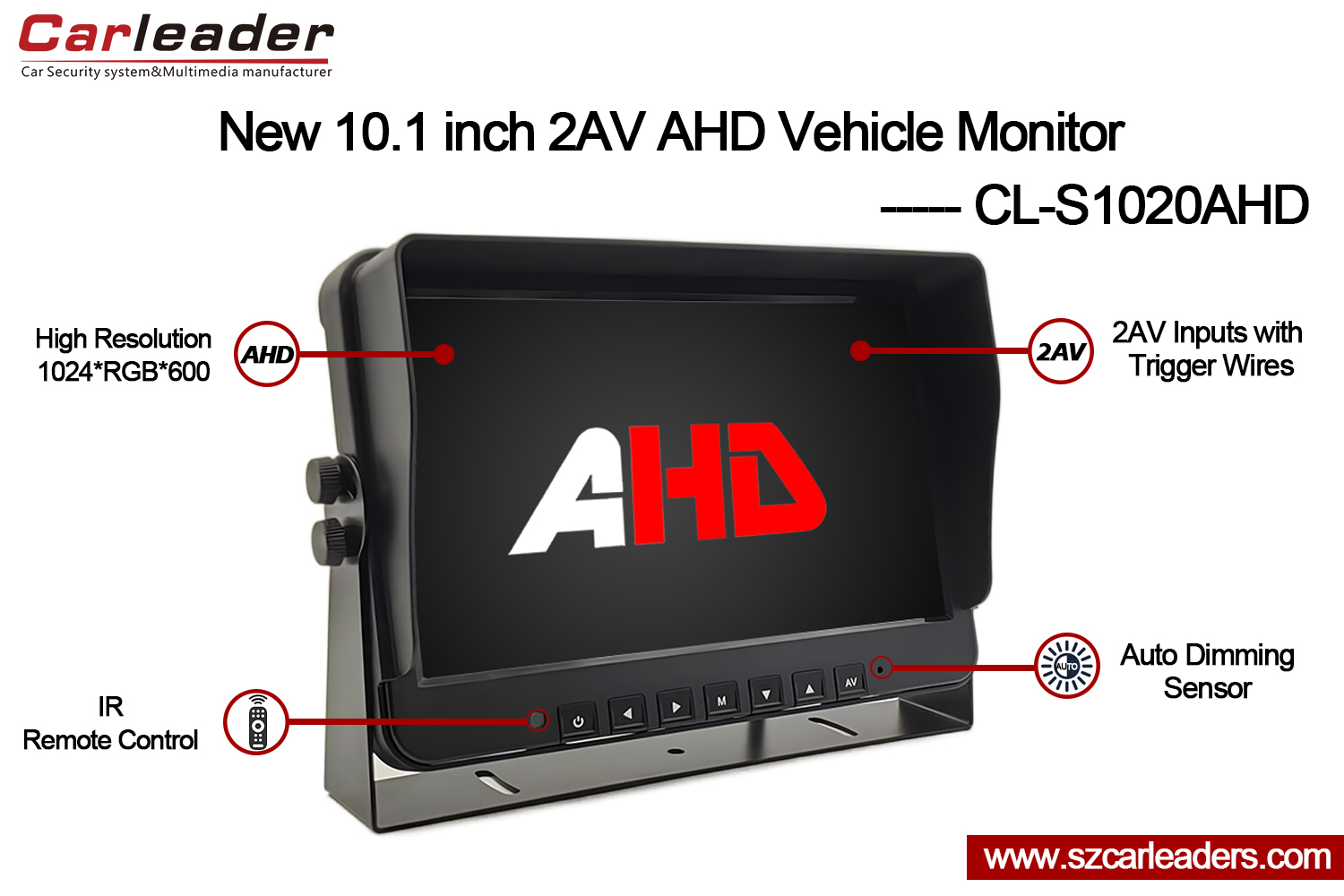 Carleader10,1-инчов 2CH AHD входен резервен монитор за превозно средствоподходящ за камиони, автобуси, ванове, фургони, училищни автобуси, селскостопански машини, строителни машини, санитарно оборудване и др.