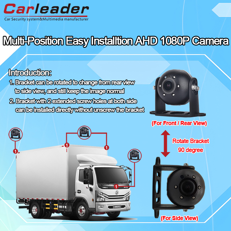 CarleaderAHD тежкотоварна камера за предно/странично/задно виждане с отвор за монтаж на скоба нагоре, надолу, вдясно, вляво, което позволява на камерата да регулира скобата на камерата, за да пасне на различна позиция на камерата, като например предно, странично и задно виждане, което прави тази камера по-съвместима за система за наблюдение на безопасността на превозни средства.