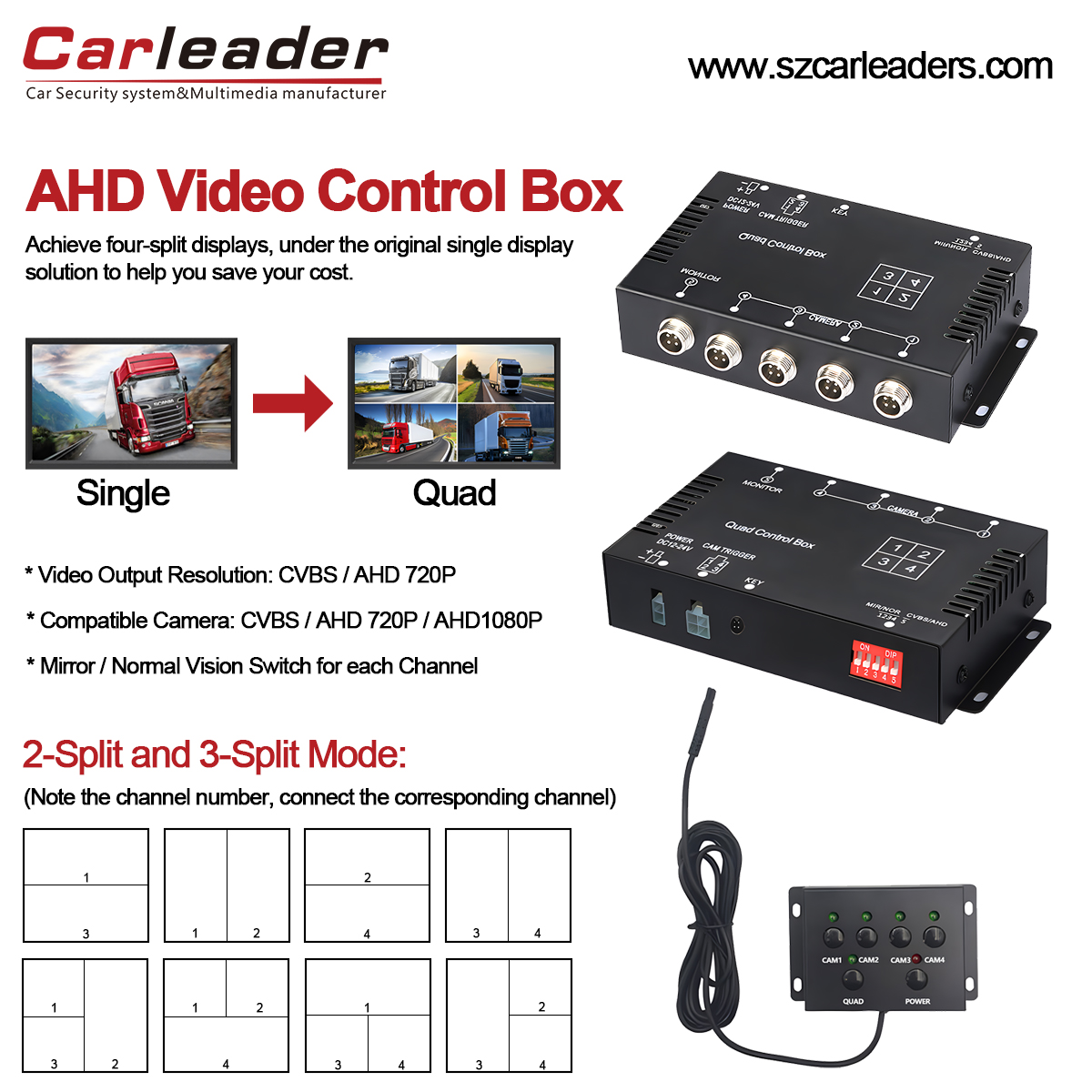 Нека поговорим за това, което трябва да знаете за CarleaderAHD Quad View Split Box видео процесорза тежкотоварни автомобили. AHD quad split контролна кутия е важно устройство за система за наблюдение на превозно средство. Разделената контролна кутия за видео камиони с автобус поддържа превръщането на един монитор в монитор с четири изгледа и може да се свърже с 4 AHD камери за автомобили. Следва подробно обяснение на функциите, характеристиките и типичните случаи на употреба на кутията за видеоуправление на AHD камерата за обратно виждане.