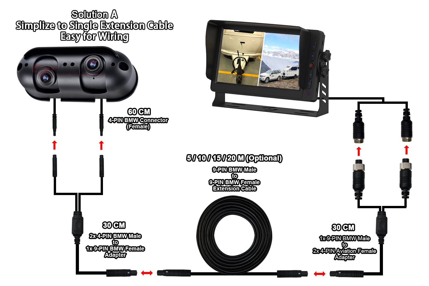 Първото решение използва само един удължителен кабел (9-PIN BMW конектор), 1 към 2 разделени кабела за двата края за свързване на камера и монитор. Тъй като това решение е само за удължителен кабел, което прави процеса на окабеляване по-лесен и удобен.