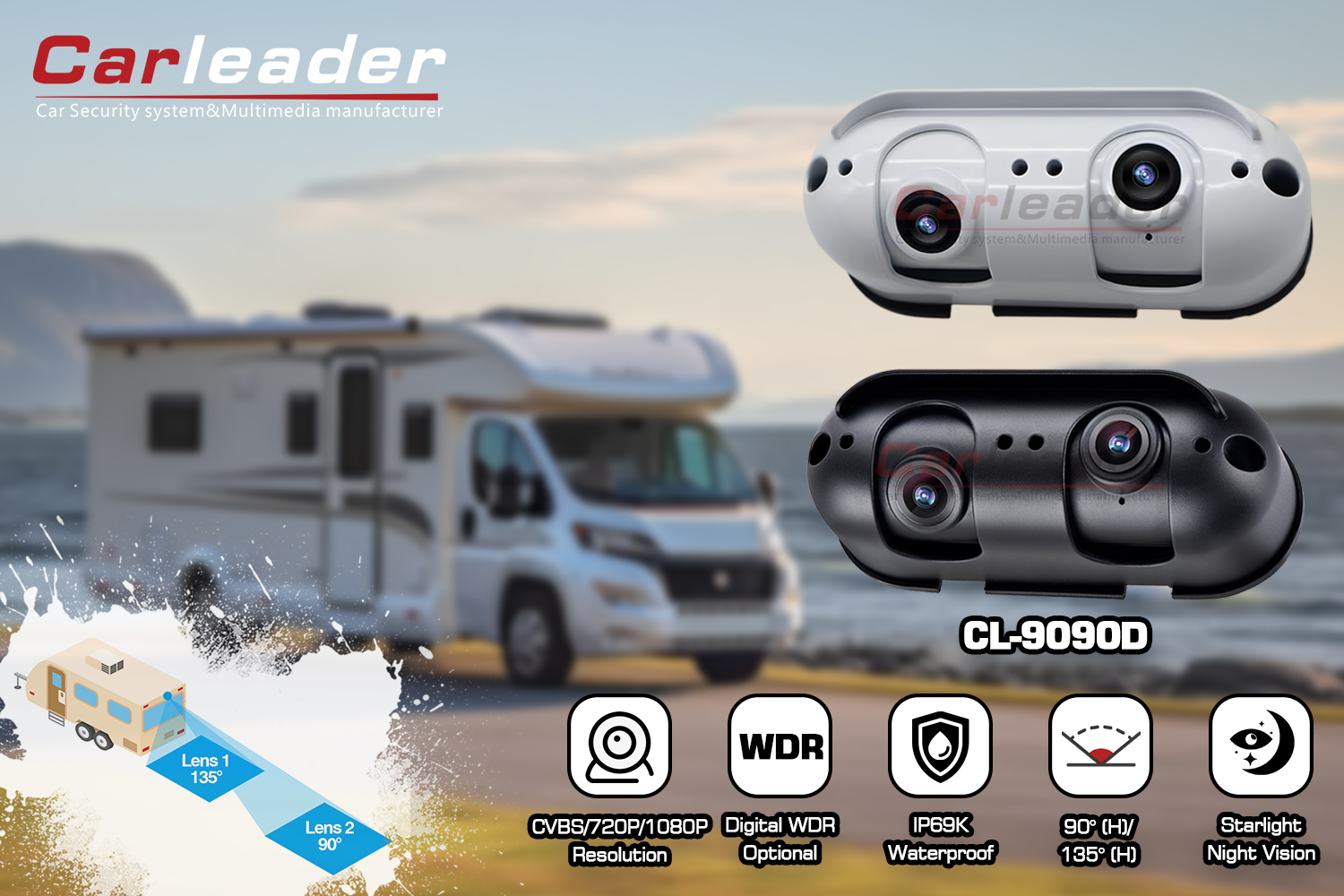 CarleaderКамера за задно виждане AHD Starlight с двоен обектив, подходяща за RV дом на колесника, повишава сигурността и видимостта на превозното средство със своя обектив с висока разделителна способност, тази камера също поддържа WDR функция за подобряване на качеството на изображението на камерата. С тези две опции за окабеляване, едното е лесно за окабеляване, а другото е с висока съвместимост. работят перфектно с потребител с различни нужди от окабеляване.