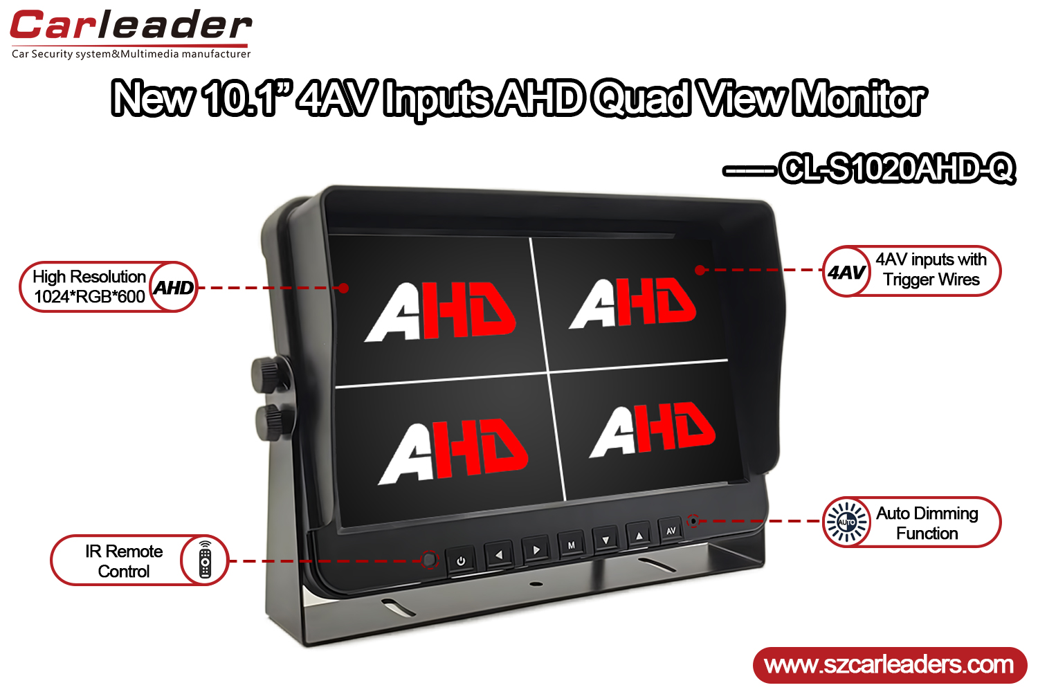 Идеален за превозни средства, приложения за сигурност и индустриален мониторинг,Carleader10,1-инчов 4CH Quad дисплей AHD монитор за тежкотоварни превозни средствасъчетава стабилна функционалност, ясно качество на дисплея и конфигурируеми от потребителя опции в компактен и издръжлив пакет.