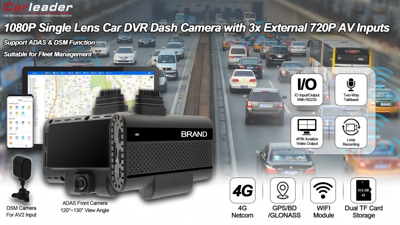 Carleader4CH AI Powered ADAS+DSM Dash Camera Поддържа видео изходе високоефективна DVR камера с един обектив, предназначена за нуждите на съвременното превозно средство за безопасност и наблюдение. Оборудван с усъвършенствани системи за подпомагане на водача (ADAS) и мониторинг на състоянието на водача (DSM), това устройство предлага цялостна сигурност и предупреждения в реално време за подобряване на безопасността при шофиране.