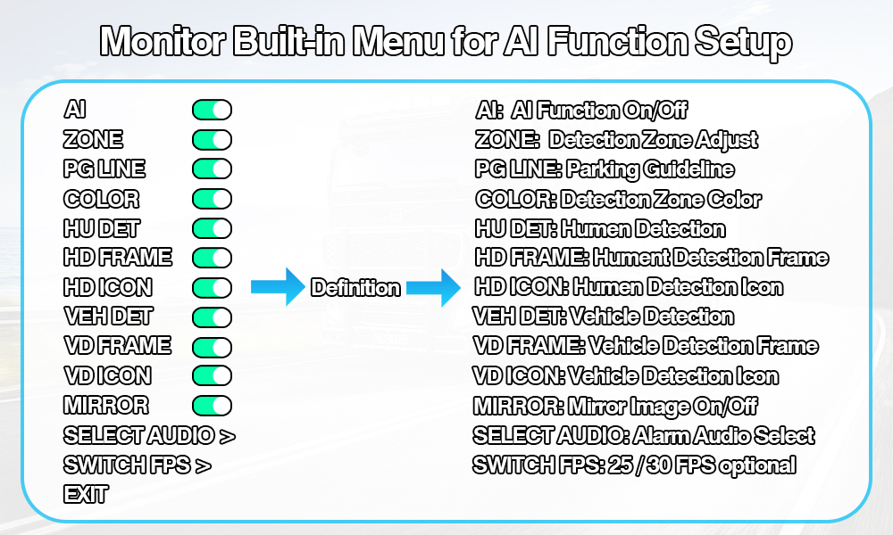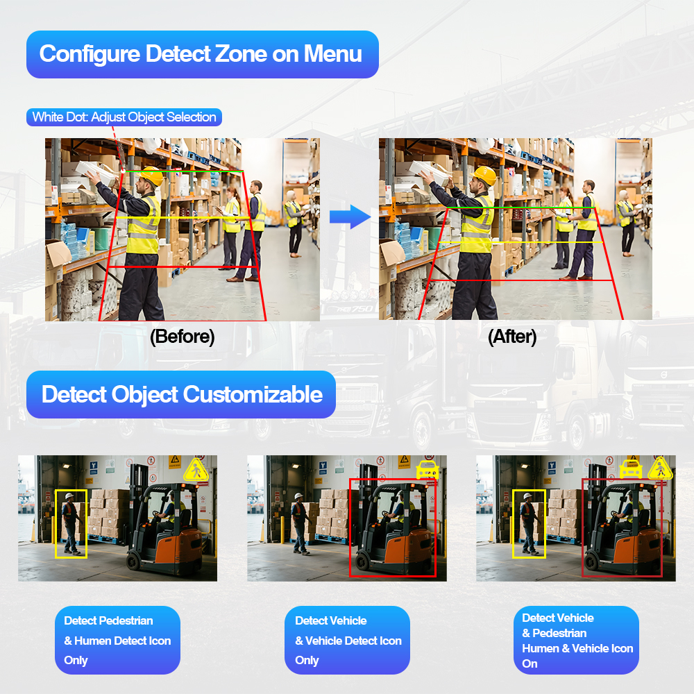 Персонализирано AI калибриране: Лесно регулирайте областите за откриване на AI чрез интуитивното екранно меню на монитора, също така можете да изберете да наблюдавате само пешеходци, само превозни средства или и двете—с включване/изключване на избираема рамка за откриване и икона на обект (пешеходец или превозно средство) наслагвания за ясна визуална обратна връзка.
